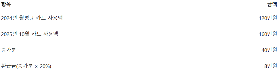 예를 들어 2024년 평균 120만원이었다면, 2025년 10월에 150만원 썼을 경우 증가분은 30만원.