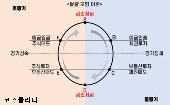 앙드레 코스톨라니는 증시의 사이클을 설명하기 위해 모래시계 또는 계란 형태의 모형을 제시했다. 이는 자산시장과 실물경제 사이의 상호작용을 시간의 흐름에 따라 나눠 보여주는 순환 모델이다. 이 모형의 핵심은 다음과 같은 흐름으로 구성된다.