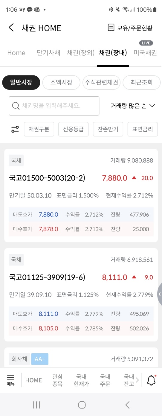 이창에 들어가보면 장내에서 거래할 수 있는 회사채권들 목록이 쭉 나타난다.