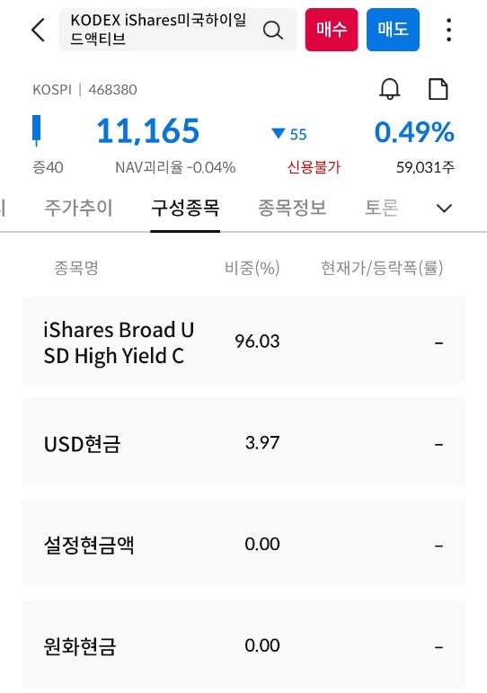 위 스크린샷을 보시면 아시겠지만, 이 상품은 미국 USHY에 96%가 투자되어 있고,